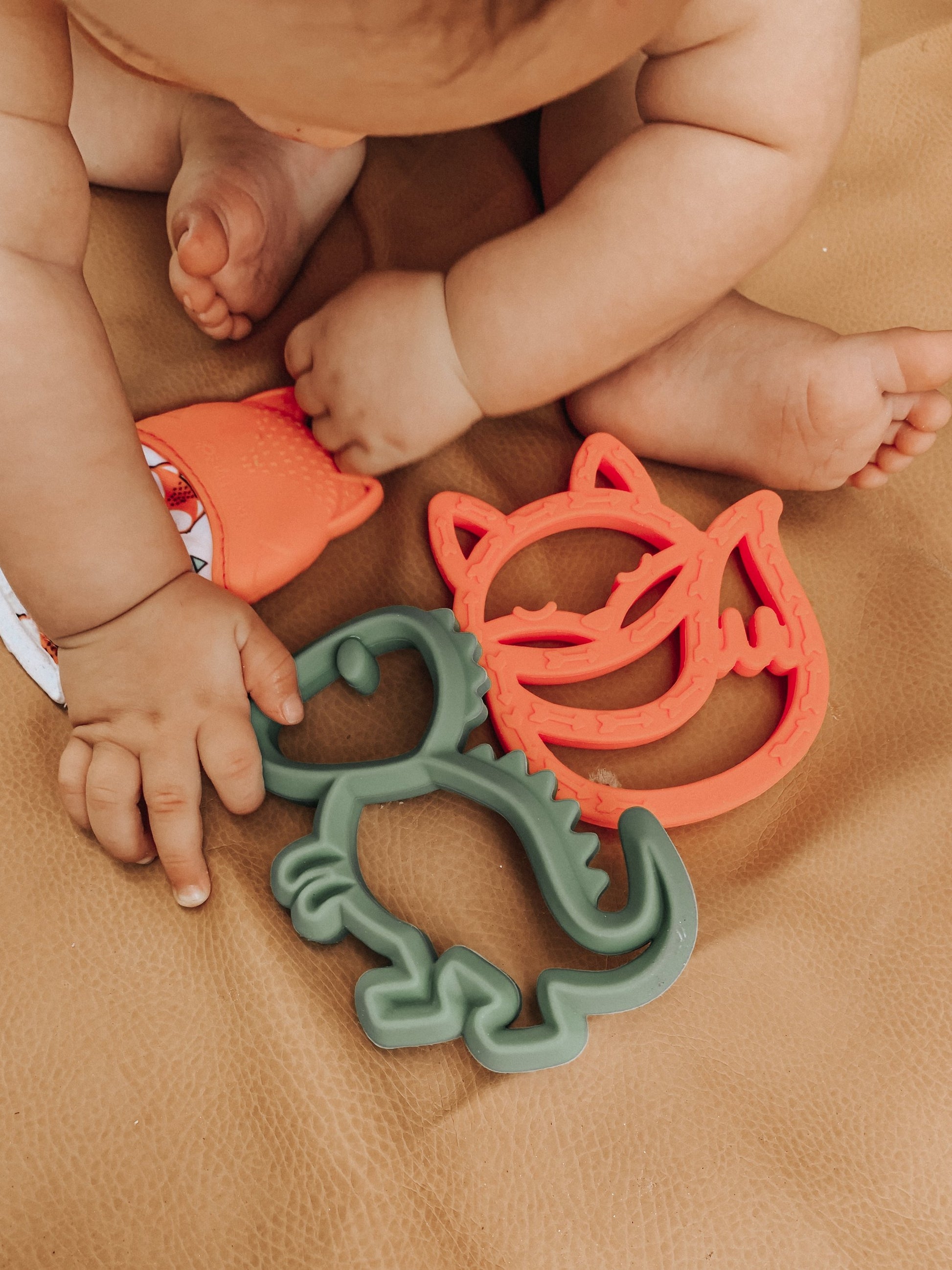 These teethers are made of non-toxic food grade silicone and have texture on one side to massage sore gums and provide relief to emerging teeth. The texture also helps your baby discover and explore new senses, so go ahead and chew on this!